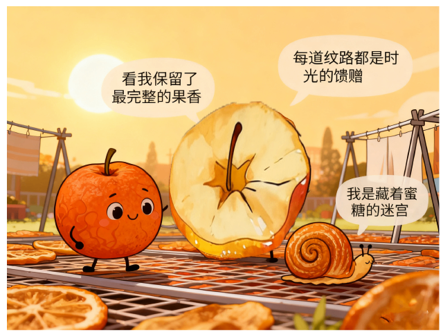 年轻果干炫耀着透明肌理:“看我保留了最完整的果香”,老果干舒展着金色皱纹:“每道纹路都是时光的馈赠”,突然有片贪玩的果干,卷成了蜗牛的形状:“我是藏着蜜糖的迷宫里”。