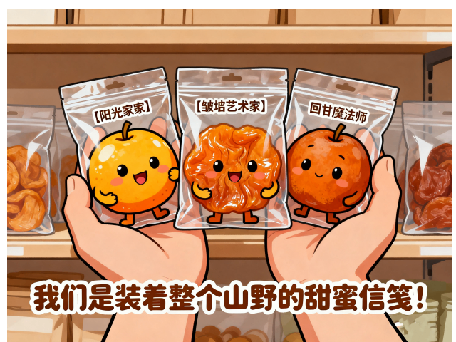 让沙果干在货架轻语:“我们是装着整个山野的甜蜜信笺!”。