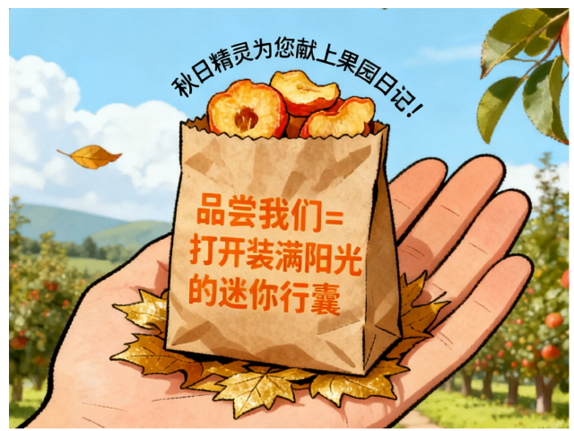 沙果干在纸袋里轻声哼唱:“秋日精灵为您献上果园日记!”当柔韧果肉在唇齿流连,仿佛看见整片果园在味蕾苏醒,连呼吸都带着山野的清新“品尝我们=打开装满阳光的迷你行囊”。