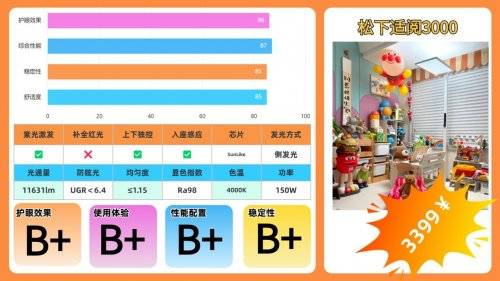 护眼大路灯什么品牌好?松下适阅3000采用SunLike紫光芯片,通过紫光激发路径避开传统蓝光灯珠容易出现的高峰蓝光问题,从光源端降低有害蓝光比例,硬件配置上,整灯搭载约 420颗全光谱灯珠,光通量可达约11600lm,配合发光面上的眩光抑制涂层,照明范围更广,光线分布也更均衡,需要注意的是,这款灯在结构设计上并未提供上下光源独立调节,同时整体定价偏高,适合有点预算的伙伴去选择。