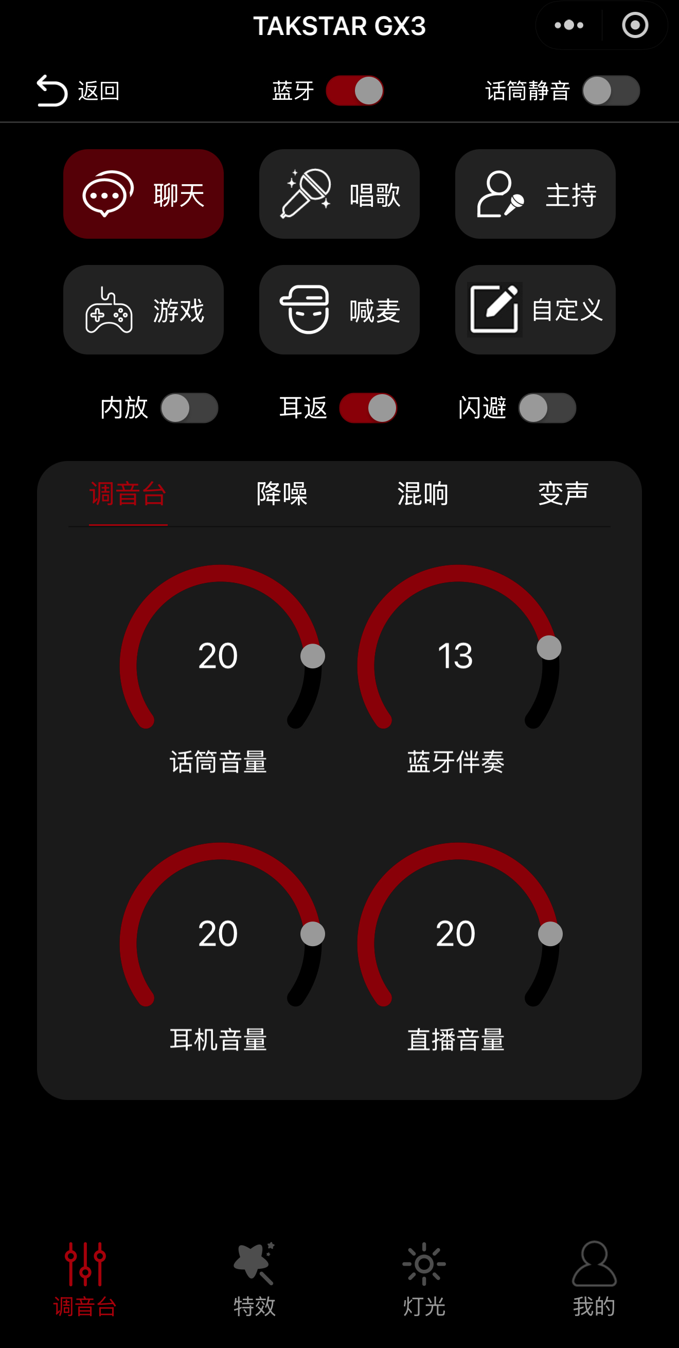 它还支持无线连接V5.3,我可以一部手机直播,一部手机播伴奏,直播和唱歌播放伴奏变得更加方便。而且它有触摸感应功能,一键就能静麦,还能一键切换聊天及唱歌模式,操作起来非常方便。复合旋钮的设计也很贴心,可以独立控制麦克风、耳机、混响3种通道的音量,还能一键循环切换,让我在直播过程中可以随时调整音量,达到最佳的效果。