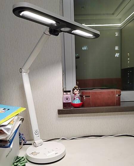 照明方面该台灯配备了一条长约50厘米的条形光源,采用直射式发光设计,能够有效覆盖约1.2米的工作区域,充分满足多本书同时摆放或多人共用时的照明需求。光线分布均匀,表现较为出色,但由于直发光结构的特点,如果灯头角度调整不当,直视光源时可能会感受到一定的眩光,建议合理调整灯头位置以提高使用时的视觉舒适度。