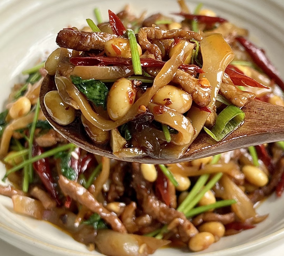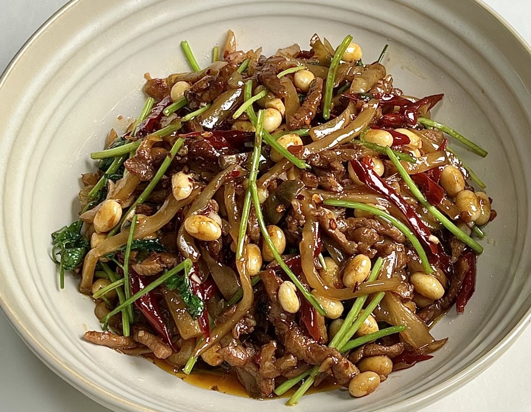 锅里留底油,爆香姜蒜小米辣,先下黄豆,中火 30 秒“蹦脆”声密集时,倒入榨菜,炒到香味开始“滋啦滋啦”冒泡,再请肉丝回锅。调味汁顺锅边淋入,锅气瞬间升腾,青红椒最后 10 秒加入,保持脆度。全程最大火力, 90 秒搞定,多一秒都算我输。