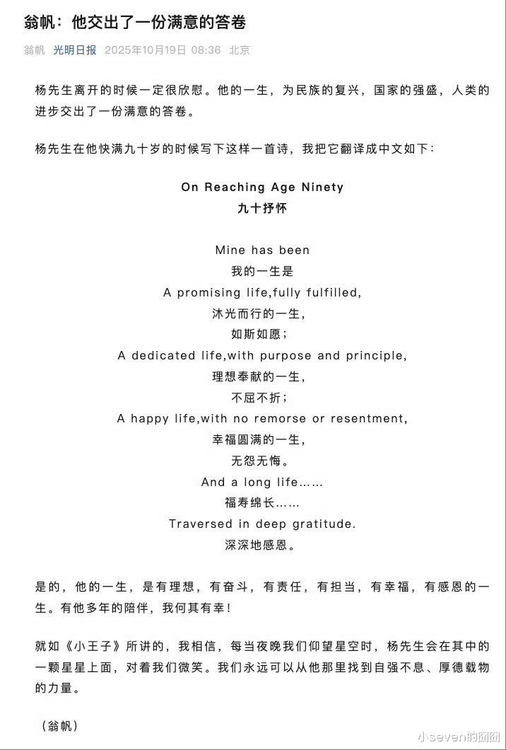 而身为杨振宁老先生的遗孀,翁帆的一举一动自然也让人关注,此前她曾发文悼念过杨振宁,称老先生交出了一份满意的答卷。