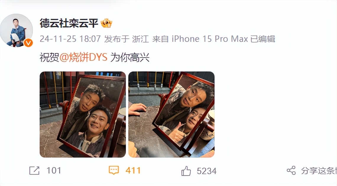 11月25日,他在社交平台晒出了和烧饼的合影,并配文“为你高兴!”烧饼也在评论区回复:“多帮你分担!”这对好兄弟的互相支持,让不少粉丝感慨:“这才是德云社的凝聚力。”