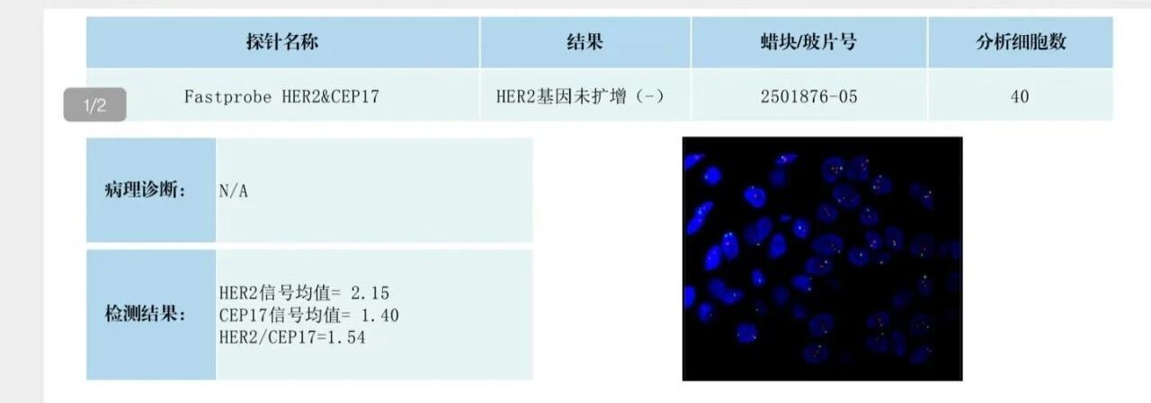 对于后续治疗,由于 her2(2+),需要进一步做 fish 检测以明确是否为 her2 阳性,现已确认为HER2基因为扩增,为阴性,意味着对靶向不敏感。
