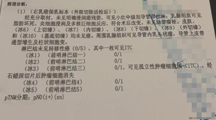 在病理诊断部分明确,未见明确浸润癌残留,可见小灶中级别导管原位癌,乳腺间质有脂肪坏死、炎细胞浸润及多核巨细胞反应,符合术后改变。然而,一枚前哨淋巴结出现了孤立性肿瘤细胞簇(ITC),也就是微转移。