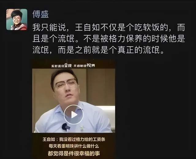 今年11月王自如在接受广东媒体采访时的一番言论让人呕吐,“我没有看过格力给我的工资条”“刚来格力的时候,就要求能不能给一间靠近董总的办公室,我要随时跟她汇报”“我每天哪怕什么都不做,就看她怎么开会,听她讲什么、做什么,都是一件很幸福的事儿”。
