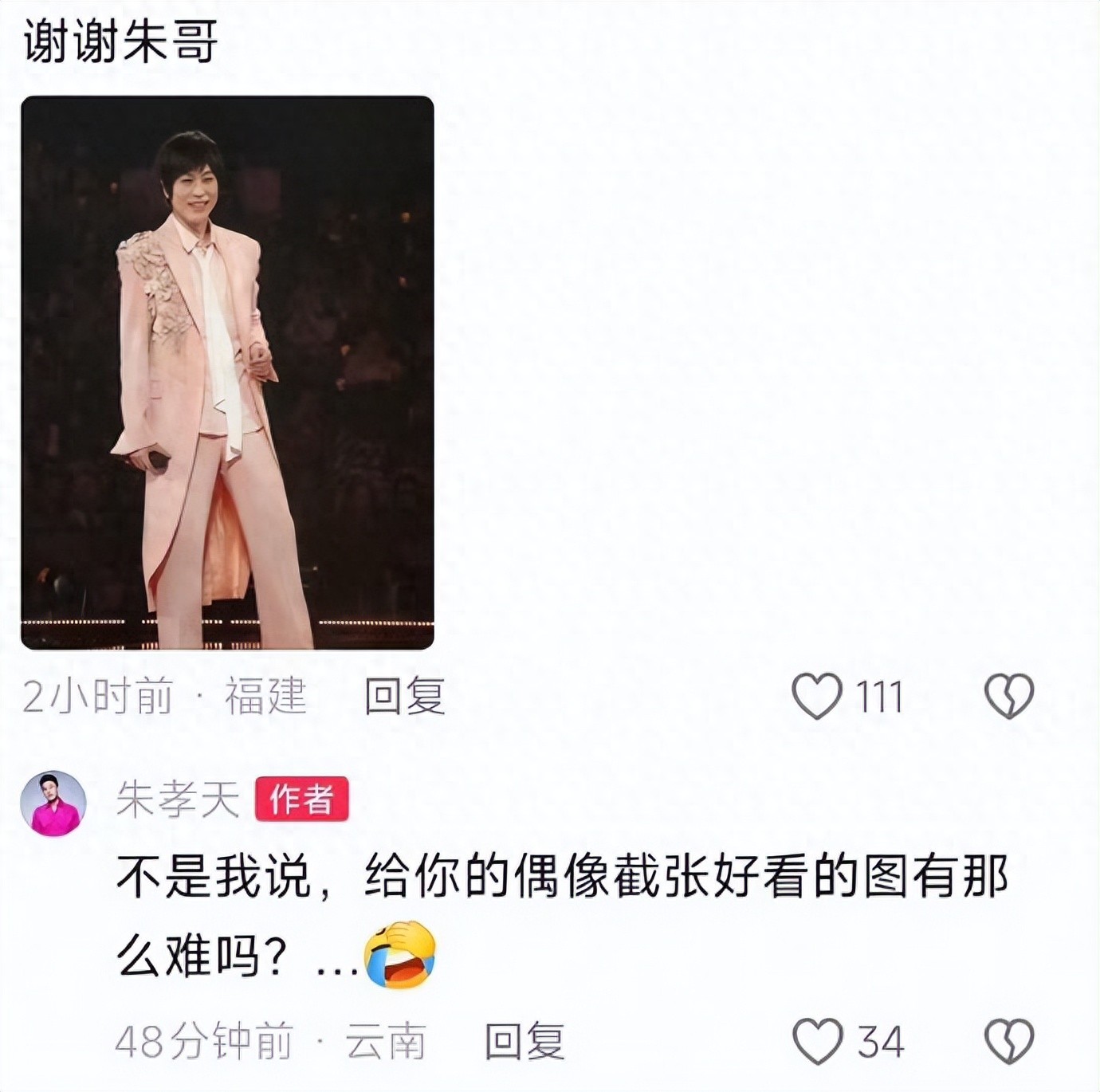 12月19日,上海演唱会的第一场结束,不知道这位朱孝天的粉丝是怎么想的,为什么在朱孝天的平台下面留言“谢谢朱哥”并附阿信舞台照。