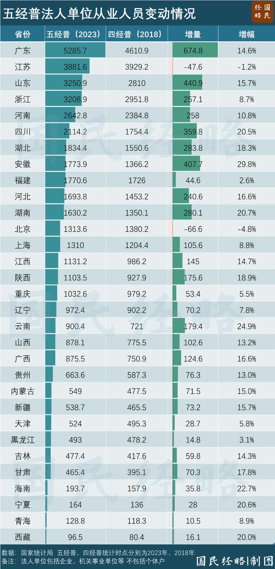 以二三产业法人单位从业人员来看,2023年广东为5285.7万人,江苏为3881.6万人,浙江也达到3200万,广东比江苏多了近1/3。