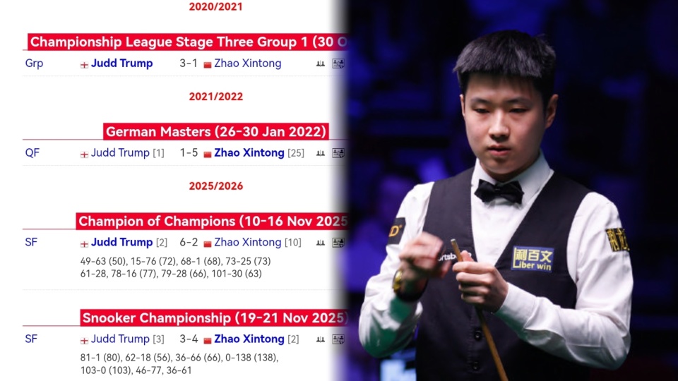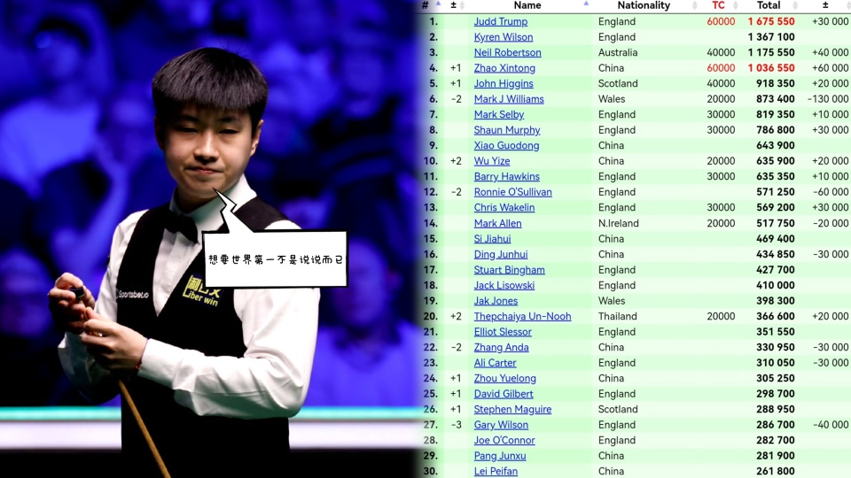 从两人生涯交手记录来看,五次交手三胜两负的特鲁姆普稍微占据一丝上风,很多球迷认为这次决赛王牌君将尽全力结束赵心童决赛不败神话,毕竟一旦这次国产准神拿下赛季第四冠(15万英镑积分),赵心童很有可能抢走自己世界第一的宝座,虽然目前小特依然领先超60万积分,但下赛季他的50万沙特赛和25万英锦赛积分将到期。