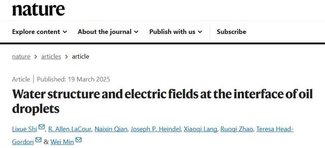 近日,相关论文以《油滴界面处水的结构和电场》(Water structure and electric fields at the interface of oil droplets)为题发表在 Nature[1]。