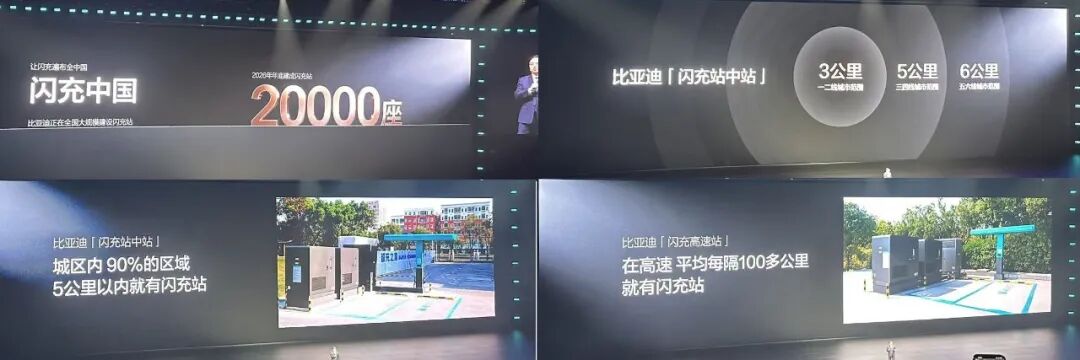 无疑全民新能源时代要来了,上千公里纯电续航加充电9分钟超1000公里续航闪充将开启新的出行方式。比亚迪将在2026年内建设完成2万座闪充充电站,不远的将来我们充电就像去加油站那么简单。那么2万座站是什么概念呢?就是一线城市每隔3公里、二三线城市每隔5公里、五六线城市每隔6公里就有一个闪充站。也就是说城市内90%的区域5公里以内就有闪充站,在高速平均每隔100多公里就有闪充站。这样可以彻底消除纯电里程焦虑的问题。那么这么快的建设速度,比亚迪何来的底气。背后的秘密就是对普通快充站的改造潜力。比亚迪的储能系统加持下可以很快的将现有普通快充站改造成闪充站。甚至发布会承诺只要有超过4位闪充车主申请指定的普通快充站改造,比亚迪承诺一周内完成闪充站的部署。