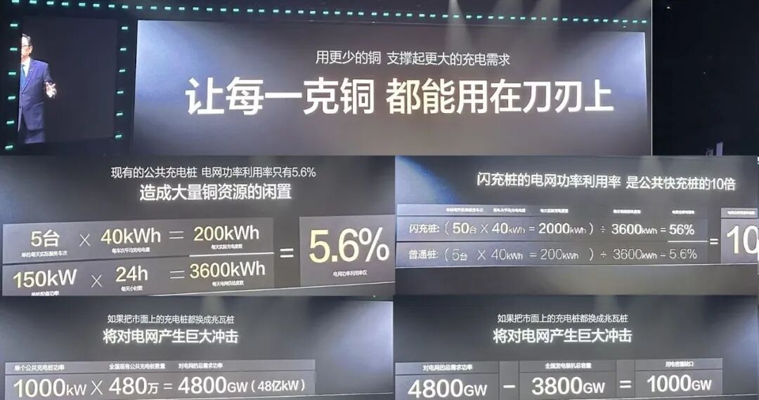 这里发布会上王传福总裁带大家算了一笔能源账,这一算真是吓一跳,说关乎国运一点不过分。我们目前的充电基础设施已经远超其他国家领先全球,但是相比每个加油枪每天可以服务50台车的情况我们的150kW快充桩每天平均只能服务5台车。基础设施背后的稀缺铜资源被大量闲置。而如果现有480万充电桩都换成兆瓦闪充则需要4800GW总功率,比全国发电总量3800GW还多1000GW的缺口。但比亚迪闪充站采用“储充一体化”设计,储能系统能缓解电网压力,支持短时大功率放电解决了这一难题。将闪充桩每日平均服务车辆数提升至与加油枪相同的50台,电网利用率是公共充电桩的10倍。让每一克铜都能用在刀刃上,更多的铜可以用在数字基建和AI大算力的建设上。