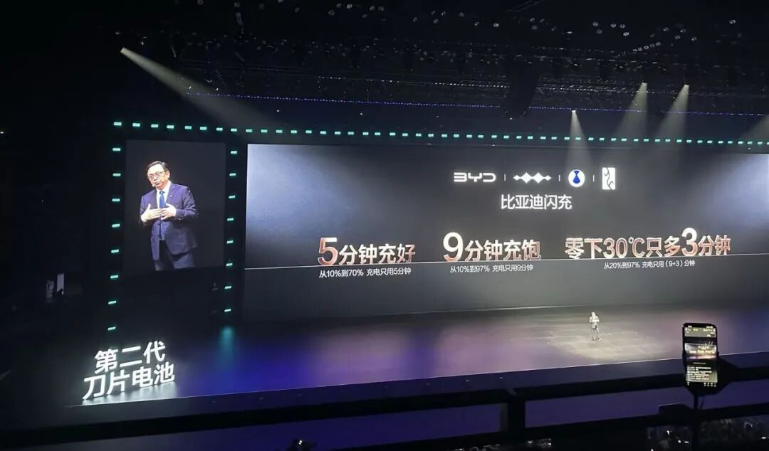 比亚迪第二代刀片电池闪充技术的革新和上千公里续航的纯电车型的大面积推广。比亚迪兆瓦闪充技术,顾名思义,充电功率达到了兆瓦级别,几乎可以媲美传统燃油车的加油速度。10%-70%电量5分钟充好,10%-97%电量9分钟充饱,零下30度只多3分钟。这意味着,电动汽车的充电时间将大大缩短,用户可以享受到更加便捷的充电体验。