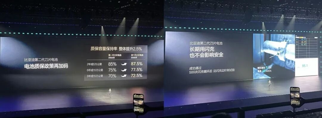 同时比亚迪刀片电池做到了既要又要,既要闪充又要长寿命。比亚迪第二代刀片电池支持10%-97%全程高倍率充电,低温充电效率也得到显著优化。其背后的秘诀还是对电池材料的理解和优化。正负极材料做到了极致的散热性能,电芯也采用了最新的短刀设计。智能热管理技术的迭代电池冷媒双面直冷为兆瓦闪充保驾护航,并且低温下仍能够进行兆瓦级别极速充电。并且承诺电池质保政策再加码,质保容量保持率整体提升2.5%。并成功通过500次闪充循环后,也就是相当于30万公里行驶使用后仍然能够边闪充边针刺实验不起火不爆炸。长期用闪充也不会影响安全。
