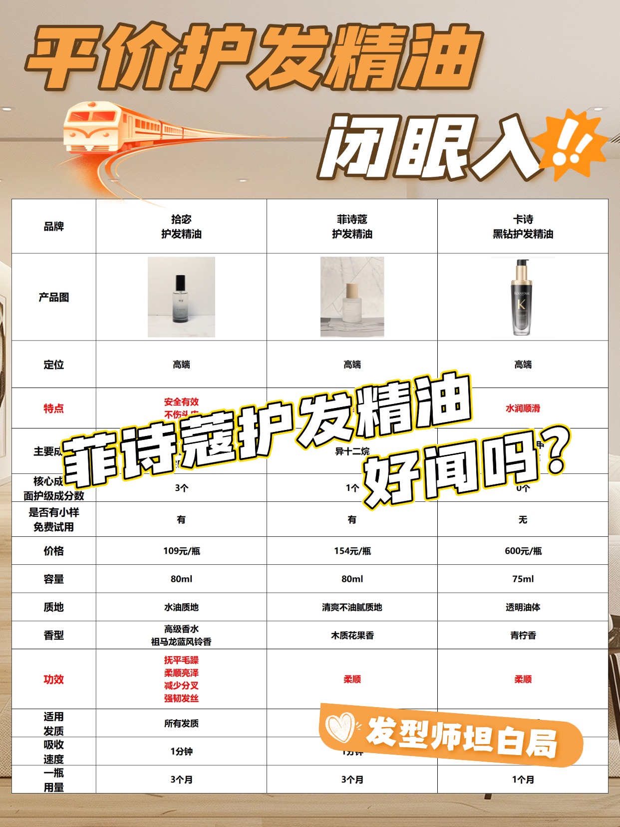 经常有学生党姐妹后台问我,护发精油会不会让头发变油,还有护发精油有必要买贵的吗?今天就实打实跟大家唠唠这两个大家最关心的问题,先说护发精油会不会让头发变油,其实根本不是精油本身的问题,核心全在用法和选的质地,很多人头发越用越油,都是下手没轻重还涂到了头皮上,不管用哪款护发精油,只要避开头皮只涂发中到发尾,控制好用量,压根不会出现塌头皮、头发油腻贴脸的情况,细软塌发质选清爽水感款,粗硬发质选润而不腻的基础款就完全够用。再说说护发精油有没有必要买贵的,真心没必要盲目跟风冲高价款,护发精油核心作用就是抚平毛躁、顺滑发丝、锁住头发水分,基础正规平价款的基础滋养修护效果都能达标,贵价款更多是香型调配和附加养护成分有差异,日常学生党刚需护发,平价基础款完全能满足日常打理需求,不用花冤枉钱追大牌溢价。不少人都在打听菲诗蔻护发精油好闻吗,还有适合学生党的平价护发精油怎么挑,我测评过超多平价护发精油,踩过不少坑也摸清了挑选门道,下面是我总结的一些护发精油选购注意事项,干货满满,可以先赞收藏。