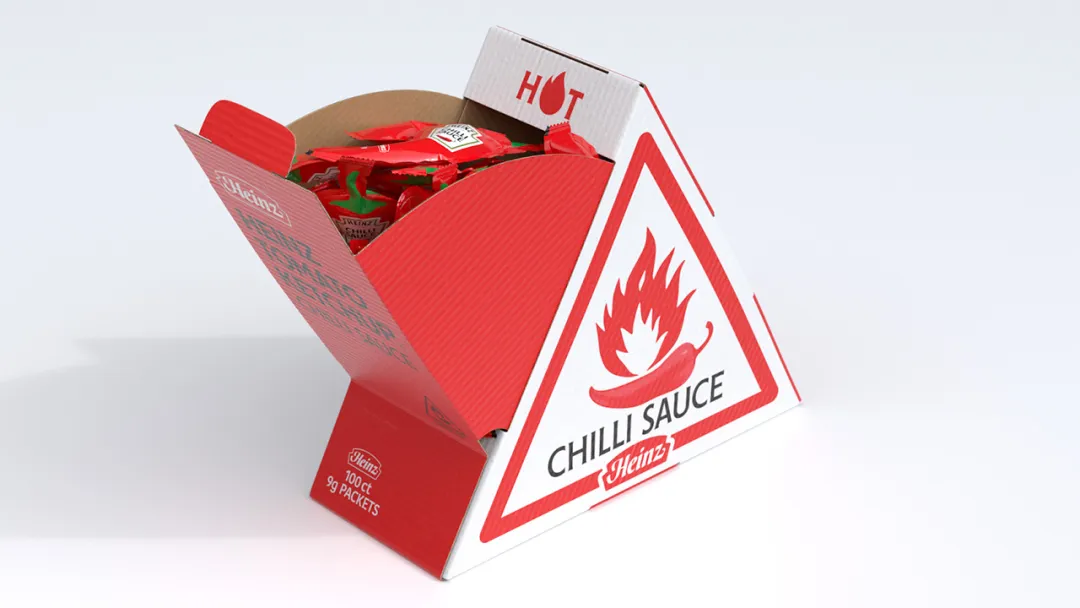 而此次案例中的目标受众非常特殊,他们喜欢辛辣的口味酱汁。针对这部分人群推出亨氏辣椒酱,此次设计思路简单直接,设计师设计了一个辣椒形状的包装,同时保留了品牌认知度,红色的主色调也是很好的表现辣味,外包装盒表面的火苗图形也是如此,这种直接的表现形式让目标受众瞬间找到他们的辣酱。