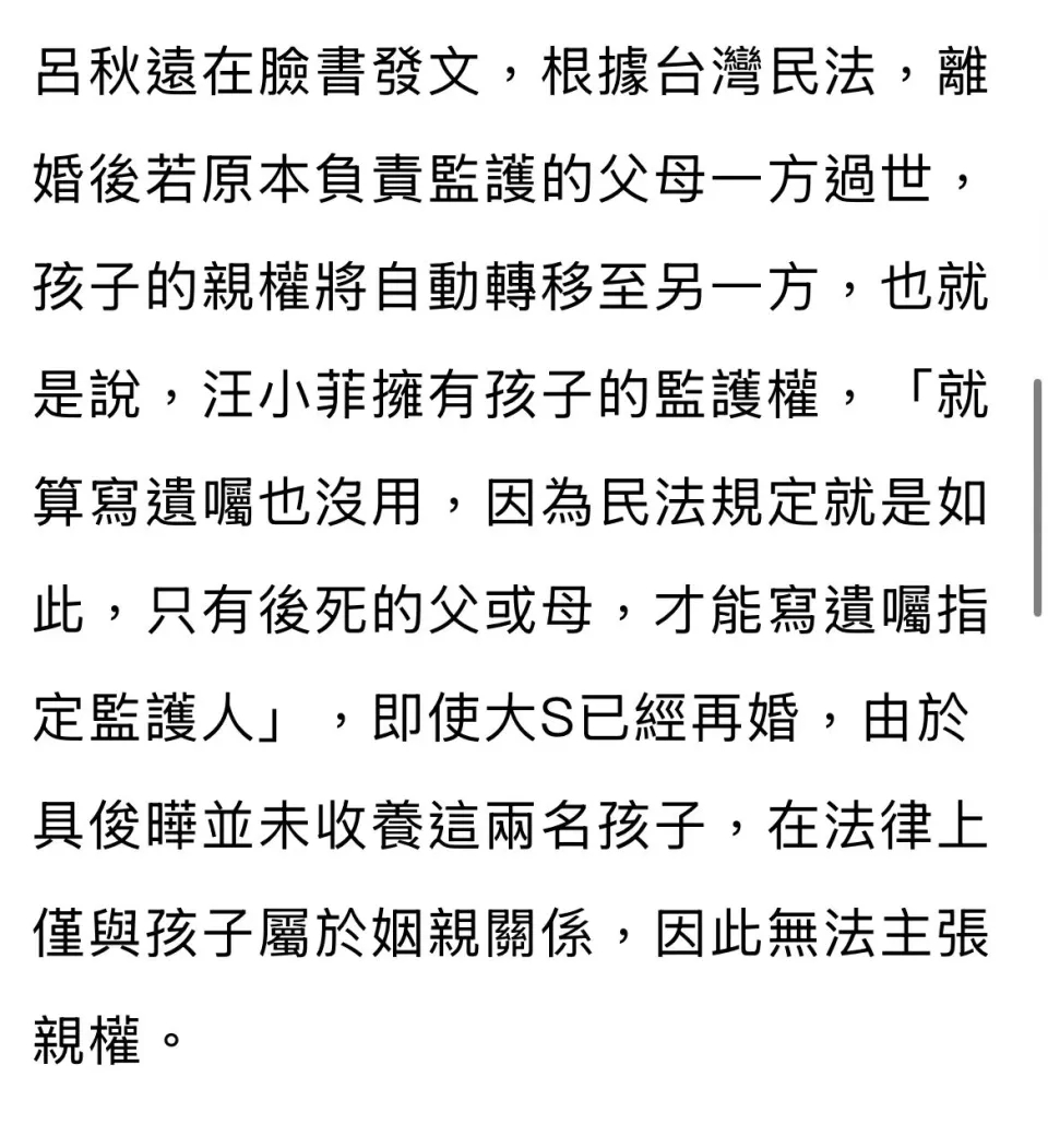 台湾省当地的法律专家发文说,关于两个孩子的抚养权,根据当地法律规定,离婚后如果原本负责监护的父母一方过世,孩子的“亲权”将自动转移至另一方,也就是说,汪小菲拥有孩子的监护权。
