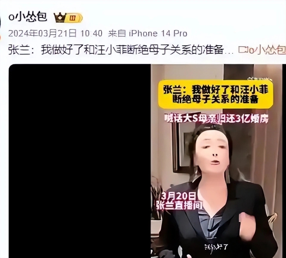 2024年3月,当时汪小菲和大S互相指责对方对待感情不忠,一度闹得非常激烈。张兰非但没有劝阻,反而开直播煽风点火,要汪小菲硬刚大S。但是汪小菲并没有听从,这让张兰很不满意,表示“做好了和汪小菲断绝母子关系的准备”。
