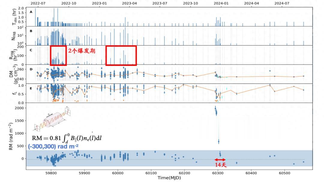 在前一年半的常规监测中,反映传播路径上自由电子密度与磁场强度的关键参数RM始终在-300至+300弧度/平方米的范围内小幅波动。然而,在2023年12月,团队观测到该暴源的RM在短时间内急剧跃升至约2000弧度/平方米,变化幅度高达此前标准差的20倍,随后在两周内单调下降并恢复至常态。