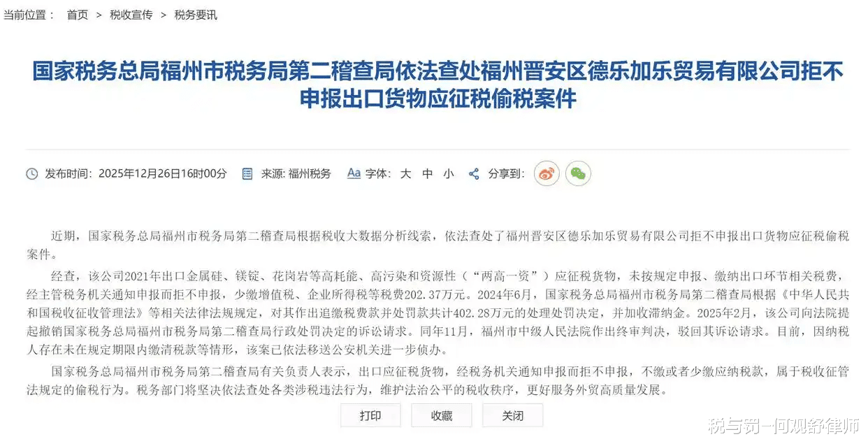 经查,该公司2021年出口金属硅、镁锭、花岗岩等高耗能、高污染和资源性(“两高一资”)应征税货物,未按规定申报、缴纳出口环节相关税费,经主管税务机关通知申报而拒不申报,少缴增值税、企业所得税等税费202.37万元。2024年6月,国家税务总局福州市税务局第二稽查局根据《中华人民共和国税收征收管理法》等相关法律法规规定,对其作出追缴税费款并处罚款共计402.28万元的处理处罚决定,并加收滞纳金。2025年2月,该公司向法院提起撤销国家税务总局福州市税务局第二稽查局行政处罚决定的诉讼请求。同年11月,福州市中级人民法院作出终审判决,驳回其诉讼请求。目前,因纳税人存在未在规定期限内缴清税款等情形,该案已依法移送公安机关进一步侦办。