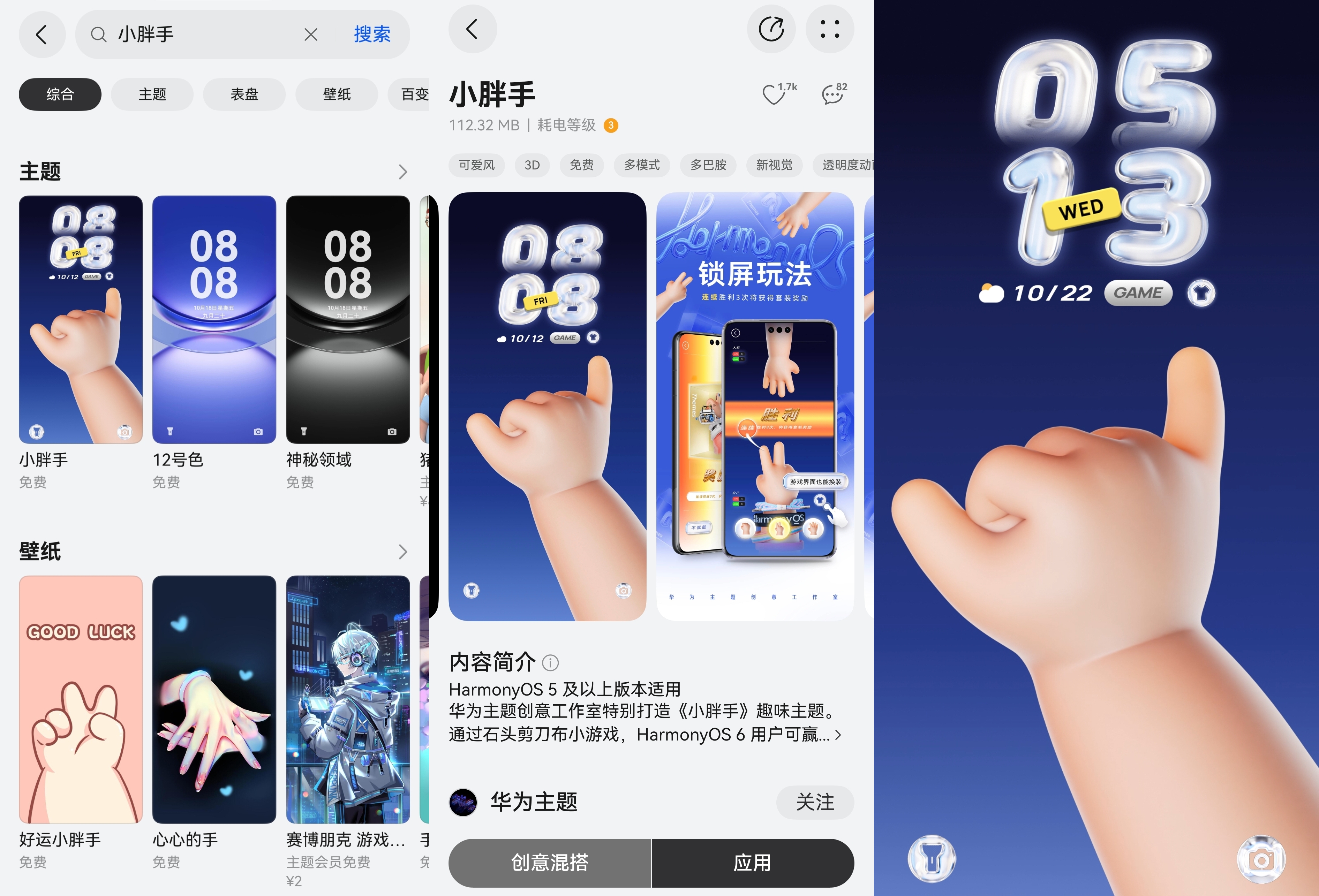 已经更新到了鸿蒙6.0的朋友也可以去看一看,就在华为主题APP里。不用花钱,直接去搜“小胖手”就能看到那个单手比六的小胖手了。偶尔换个心情,体验一下,给日常用机添点小乐趣,也挺好的。