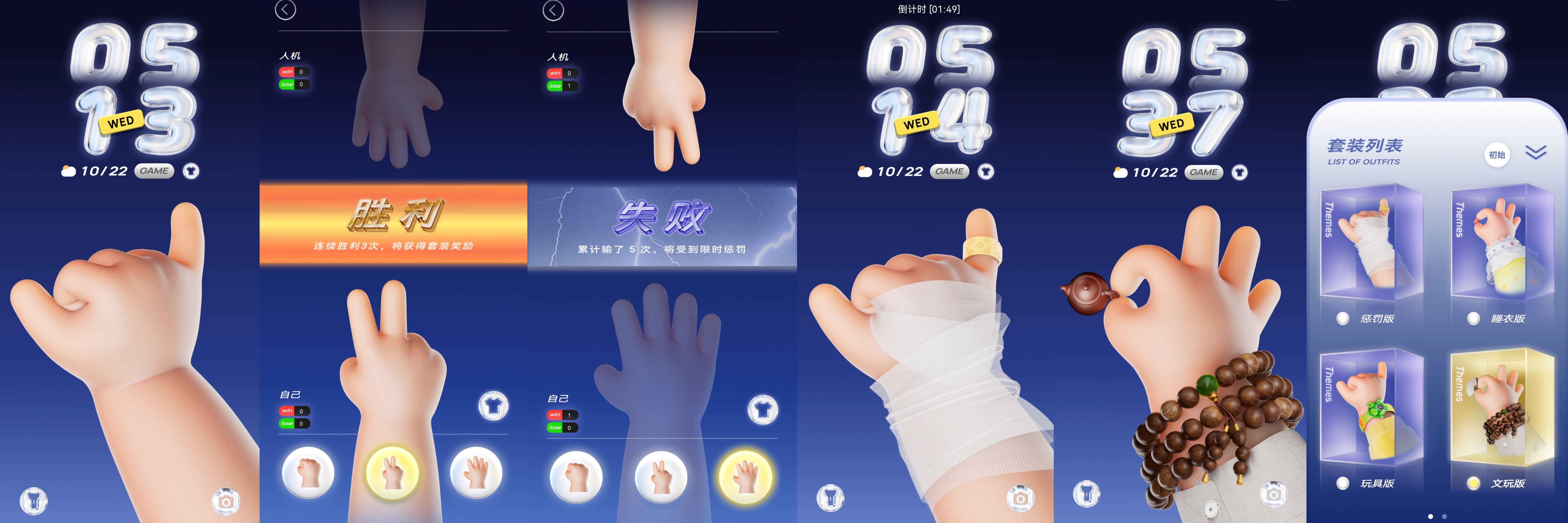 在锁屏界面点击“GAME”按钮就能够进入猜拳小游戏画面啦。无论输赢,这里都有惊喜可以解锁。如果“剪刀石头布”,连续赢三次,就可以获得一个全新样式的小胖手套装。这个套装是一个盘串儿的“文玩套装”,就像宣传页上小胖手戴上珠串的样子那样,特别逗。输了也会有小彩蛋,会送你一个带有绷带的小胖手套装,莫名感觉有点萌。不过,如果累积输了5局之后,将会被惩罚在两分钟之内不可以更换套装的。