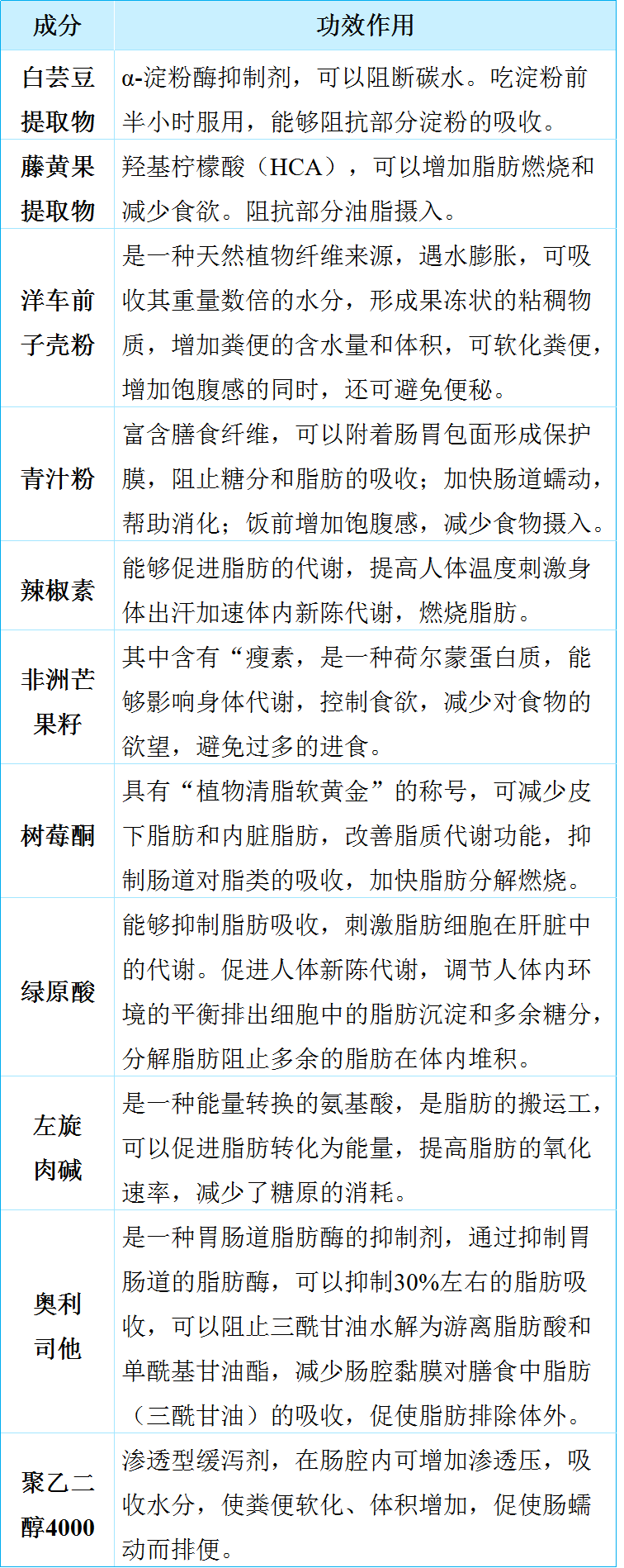减肥成分:白芸豆提取物、藤黄果提取物、洋车前子壳粉、青汁粉、辣椒素、非洲芒果籽、树莓酮、绿原酸、左旋肉碱、聚乙二醇4000、奥利司他等。