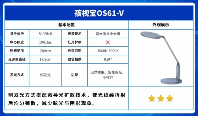 护眼灯品牌排行第一名是谁?孩视宝OS61-V这款台灯的灯头为17.8cm圆形光源面,尺寸不算大,但结合微导光扩散与侧发光设计,光线扩散效果较好,能适配大部分书桌尺寸,它的中心亮度约1041lux,满足日常读写使用基本够用。光效表现不错,显色指数达Ra97,色彩还原自然清晰,能真实呈现文字和图画的颜色。色温支持调节,可在3000K暖黄光至5000K冷白光之间切换,部分模式为3000K、4000K、5000K三档固定切换,暖光适合休闲放松,冷光适合专注学习,能适配学习、阅读、休闲等不同场景。