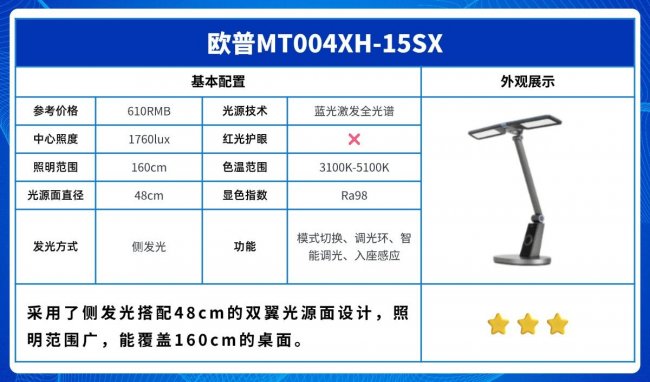 护眼灯品牌排行第一名是谁?欧普MT004XH-15SX这款台灯。它最显眼的地方,是那个可以上下翻转的双翼旋转灯头,尺寸有48厘米,用起来确实挺灵活的。官方标称的照明范围能达到160厘米,日常读书写字足够用了,中心亮度给到了1760lux,整体光线还是比较明亮的。在色彩还原方面,它的显色指数是Ra98,这意味着看东西的色彩会比较真实自然。功能上也挺齐全的,比如入座感应、自动调光,还有不同的灯光模式可以切换,底座上有个模式切换环,操作起来还算顺手。