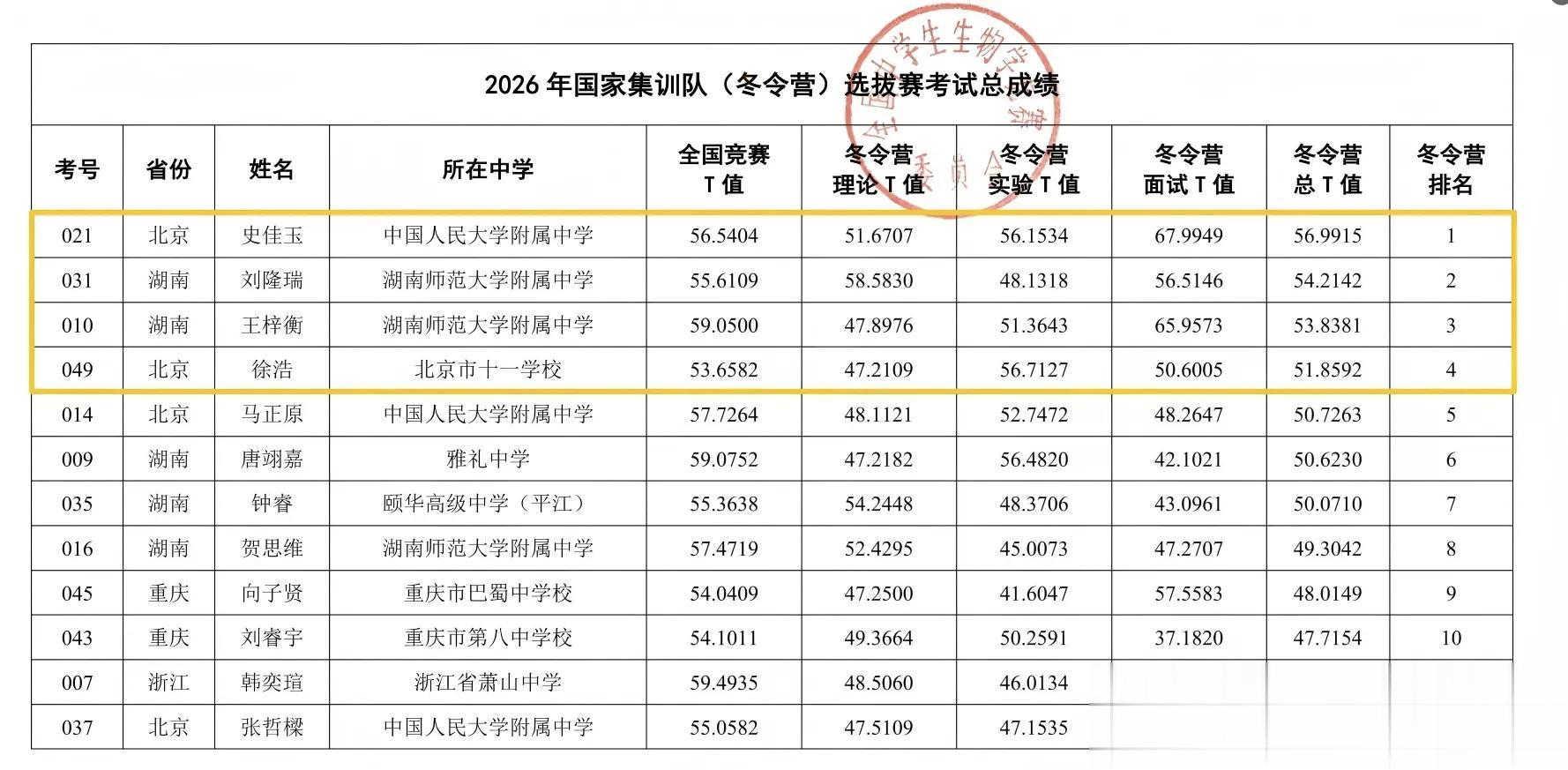 一、四强出炉:北京、湖南瓜分名额,人大附中、湖南师大附中“神仙打架”最终入选国家队的四位选手分别是:北京人大附中史佳玉(冬令营排名1)、湖南师大附中刘隆瑞(排名2)、湖南师大附中王梓衡(排名3)、北京十一学校徐浩(排名4)。从地域与学校分布看,北京与湖南平分秋色,两所“竞赛强校”更是包揽全部名额——人大附中作为北京竞赛名片,此次再登榜首;湖南师大附中则凭借“双子星”选手,彰显了在理科特长培养上的深厚积淀。