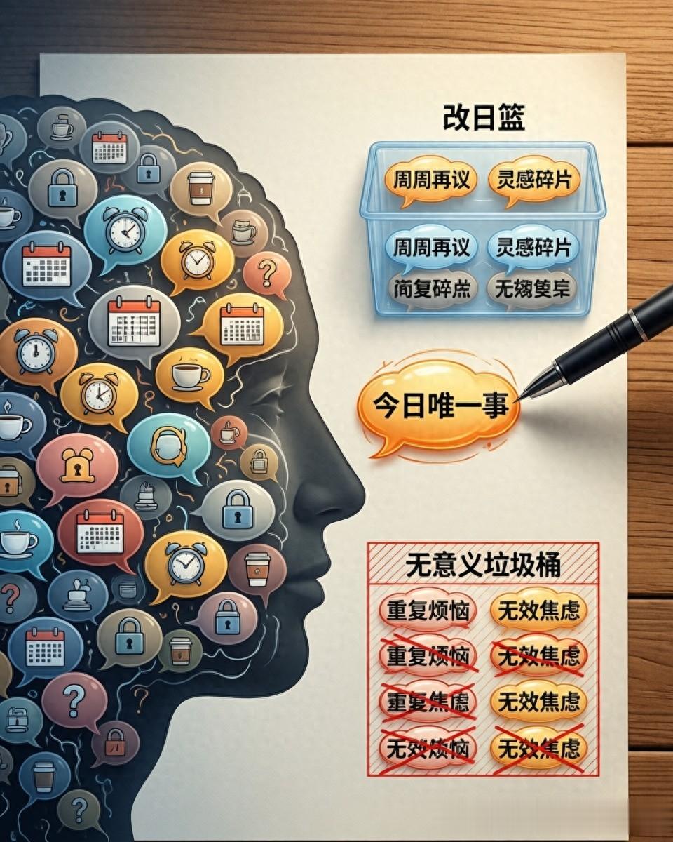 第一步:每日“心智清盘”,关掉后台程序每天早/晚,花5分钟做“心智清盘”,把那些自动运行的“后台程序”(悬而未决的念头)揪出来。
