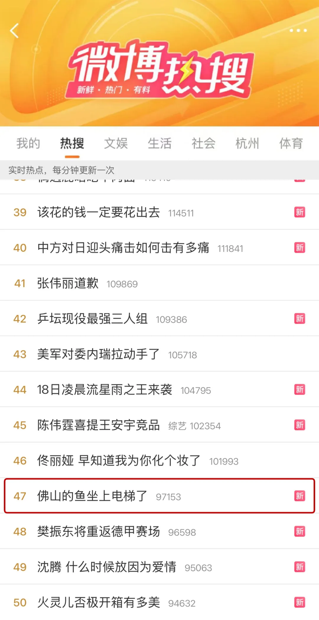 节目播出当晚,该片段#佛山的鱼坐上电梯了#登上微博热搜主榜。