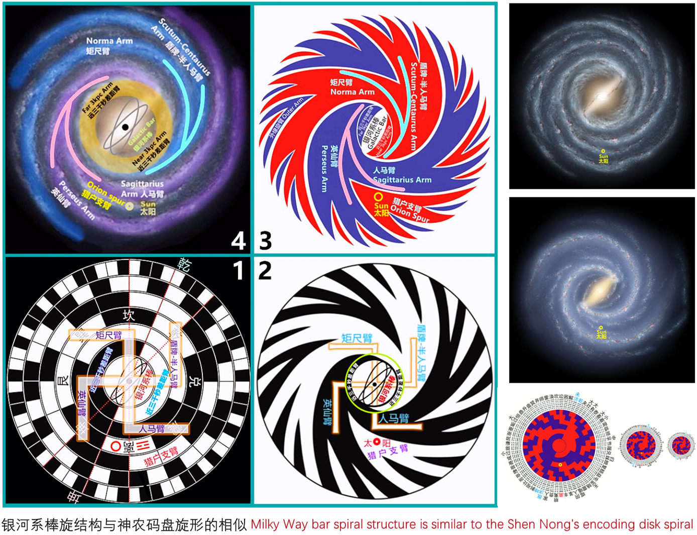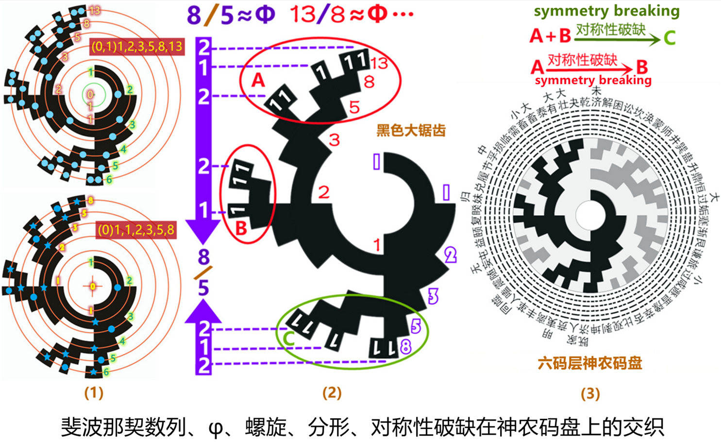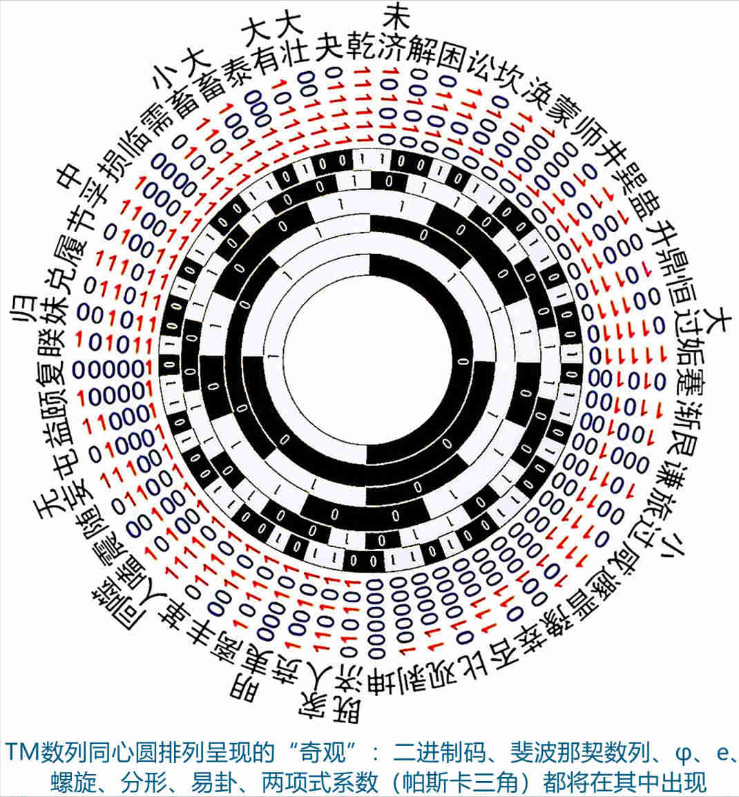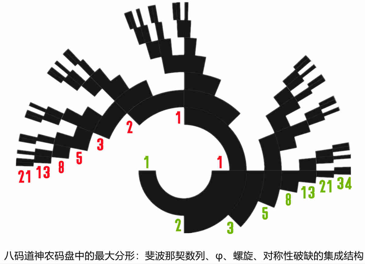 2.神农图的数学创新性神农图以圆盘结构整合了Thue-Morse数列(通过阴阳爻简并生成)、斐波那契数列(相邻同性爻合并形成齿块数序列)、自然常数e(螺旋分形路径映射)等数学规律,并揭示了与银河系旋臂结构、生物遗传密码的跨学科关联