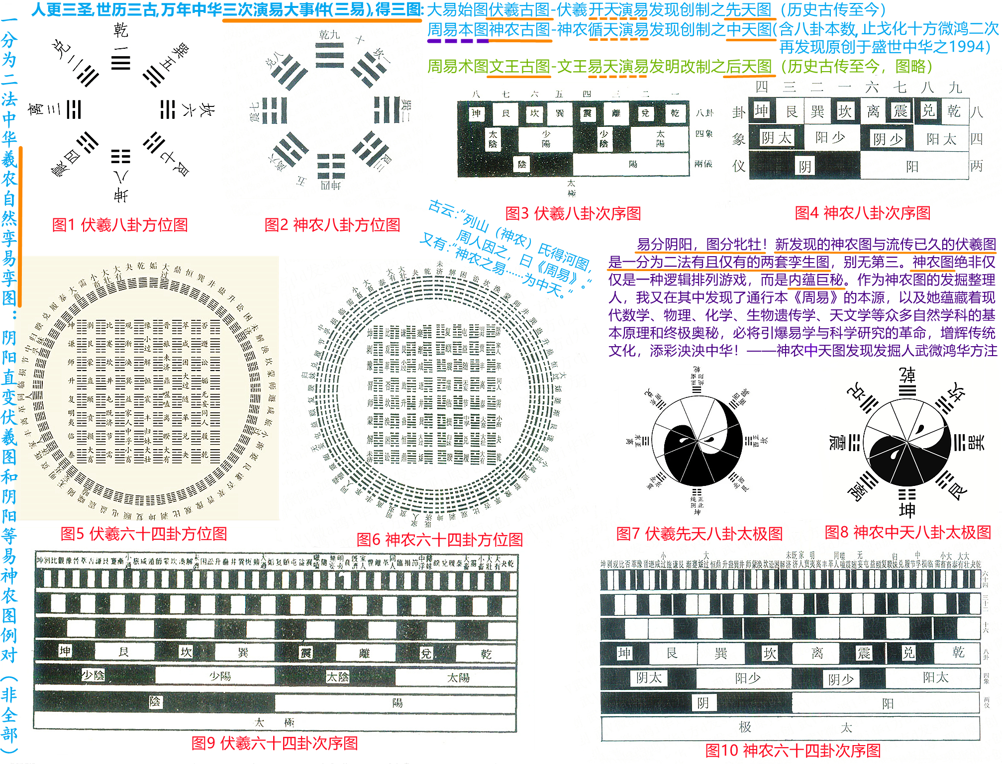 而对于易学,神农图是伏羲图唯一的阴阳孪图(从易理和数理上均可证明),代表易经本义正理,解易示道,微鸿的心愿是将它推进各级易学教材,就像伏羲图在教材中一样。