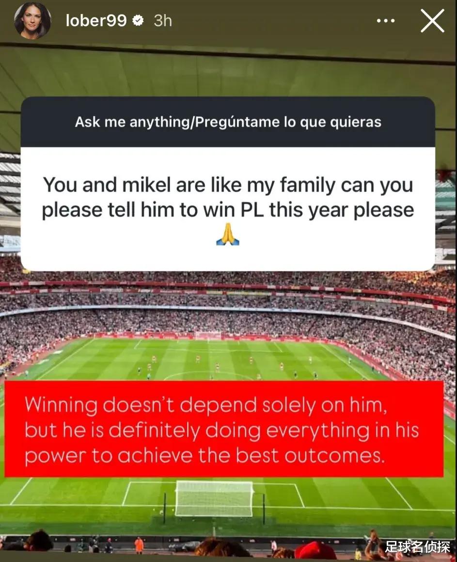 阿尔特塔的妻子Lorena在IG上发图文回应了球迷的提问,这名球迷表示“你能不能告诉阿尔特塔,请拿下今年的英超冠军”。
