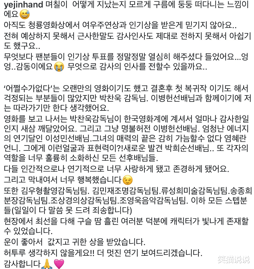 孙艺珍在文中表示,她完全没有预料到自己会获得这些奖项,所以也没来得及好好说一些表达感谢的话,让她觉得有点遗憾,于是在这里补充上。她在文中感谢粉丝们为她努力投了人气奖的票,她实在是很感动。除此之外,孙艺珍还表达了她很感谢朴郁赞导演,前辈李秉宪 ,同时,她也表示感谢电影里的所有工作人员的辛苦付出,最后,孙艺珍谦虚地表示,她是因为运气好,才能够获得如此宝贵的奖项。当然,她也不会轻易看待这份荣誉,她会更加努力提高自己的演技展示给大家看的,在结尾处,她还表示感谢大家对她的支持。