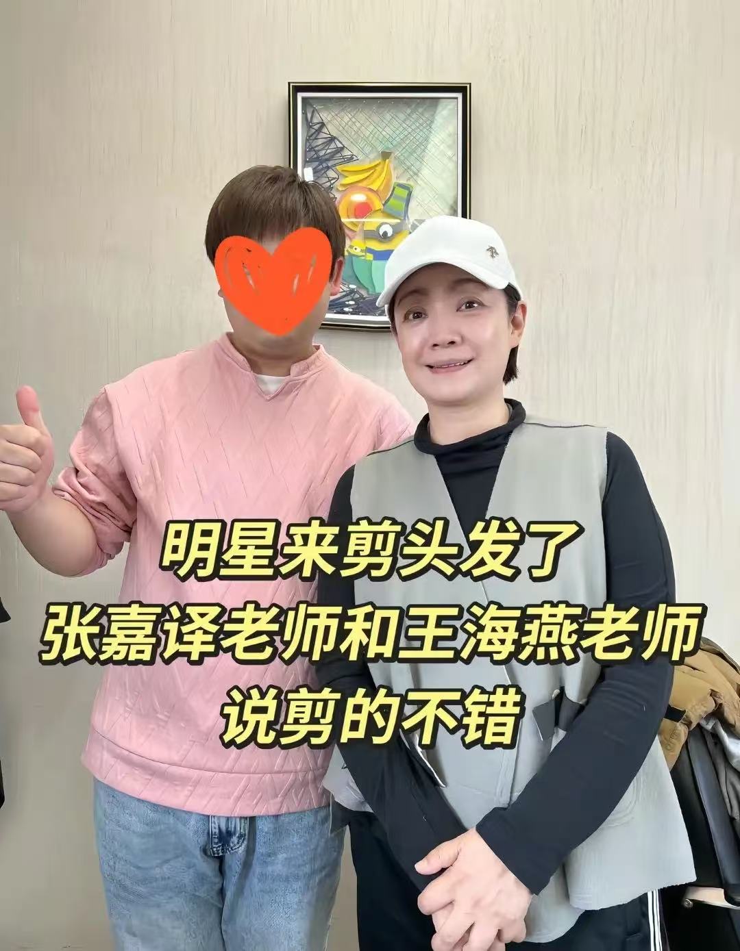王海燕把头发剪成了短发,戴着帽子很是洋气,还夸理发师手艺好。夫妻俩在同一家理发店成了招牌,都纷纷跟自己的理发师合影。