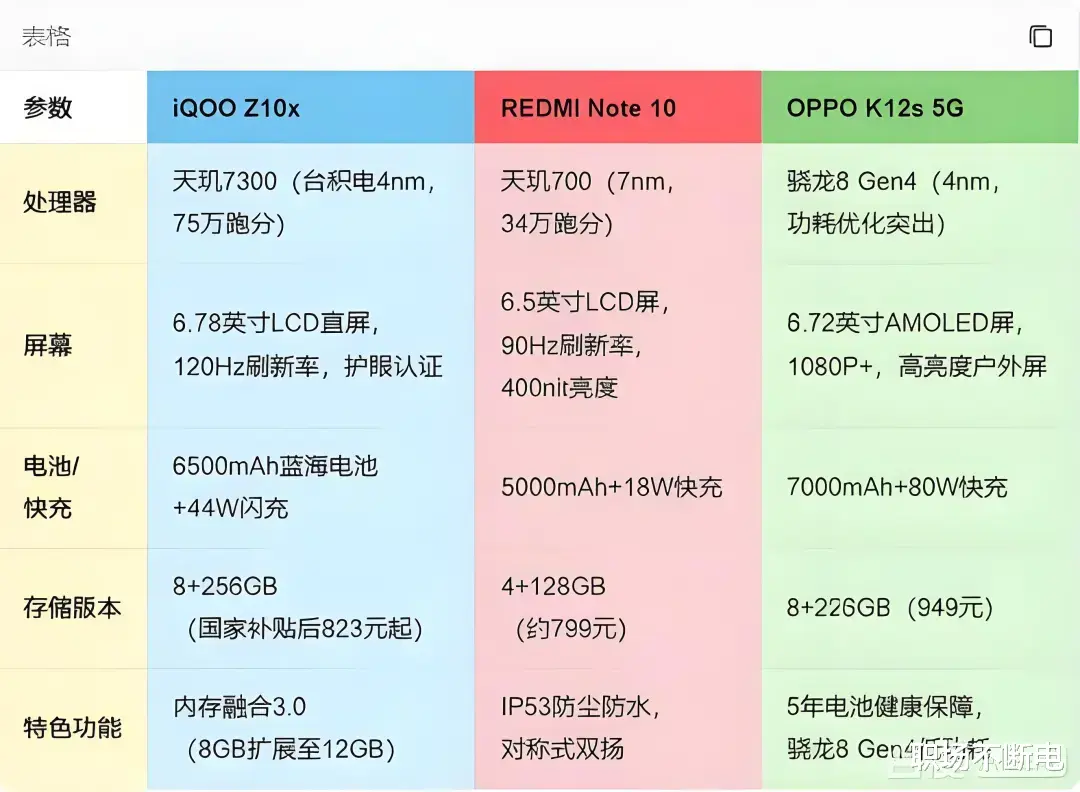 三、选购建议:三选一怎么选?看这三点就够了追求性能与游戏体验:选iQOO Z10x,天玑7300+内存扩展,75万跑分碾压同级,833元的补贴价性价比拉满。看重均衡与实用功能:选REDMI Note 10,IP53防水+对称双扬+3.5mm耳机孔,适合日常使用无短板需求。续航快充优先级最高:选OPPO K12s 5G,7000mAh+80W快充,彻底告别充电焦虑,AMOLED屏显示更细腻。