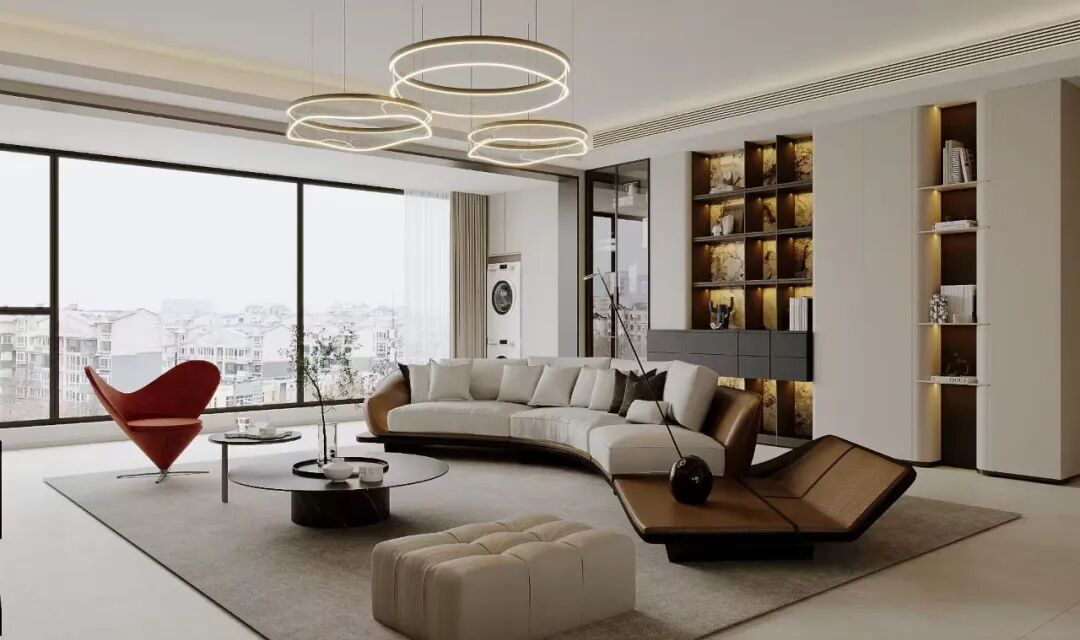 一个弧形沙发,是客厅当之无愧的视觉焦点。它流畅的曲线造型,不仅在视觉上更加柔和、优雅,也带来一种自然的包裹感和安全感,仿佛一个温暖的拥抱。它打破了传统沙发的规整布局,让家庭成员的交流互动变得更加轻松、亲密。