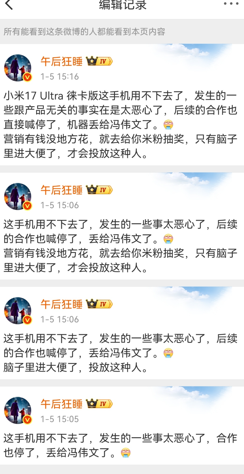 随着事件的发酵,知名博主午后狂睡连发多条博文,表示小米17Ultra徕卡版这手机用不下去了,发生的一些跟产品无关的事实在是太恶心了,后续的合作也直接喊停了,机器丢给冯伟文了。营销有钱没地方花,就去给你米粉抽奖。