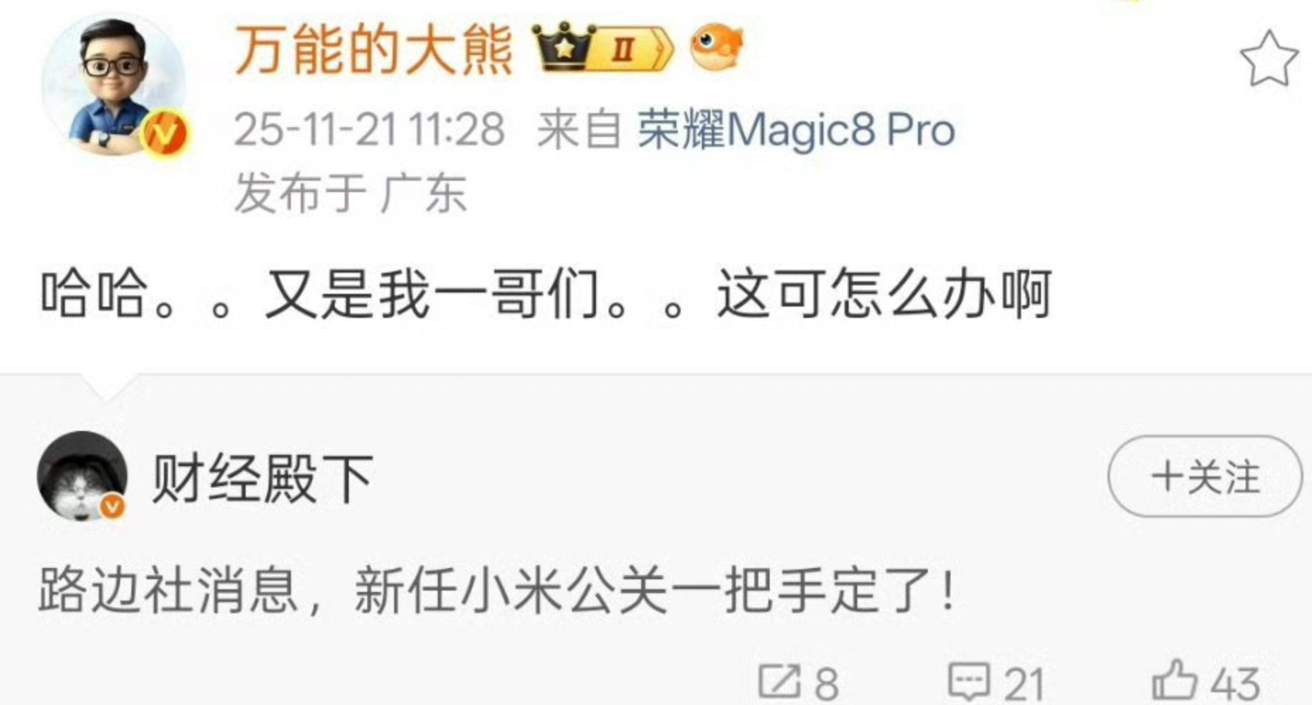 在去年11月份,万能的大熊还曾发文称小米公关一把手是他的哥们,这可怎么办啊。