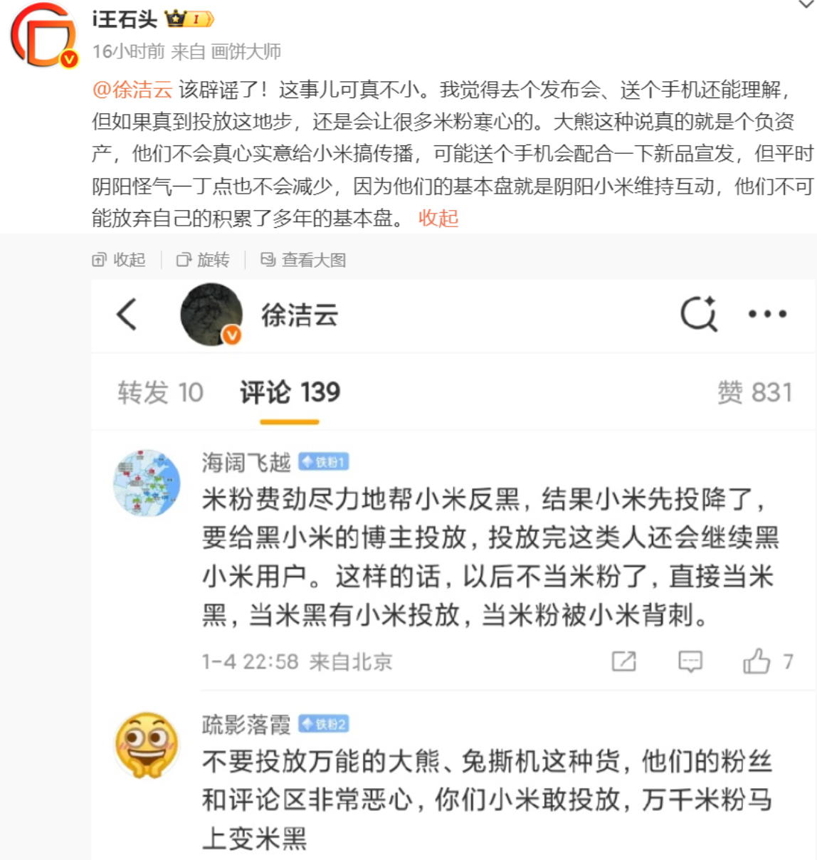 大熊这种说真的就是个负资产,他们不会真心实意给小米搞传播,可能送个手机会配合一下新品宣发,但平时阴阳怪气一丁点也不会减少,因为他们的基本盘就是阴阳小米维持互动,他们不可能放弃自己的积累了多年的基本盘。
