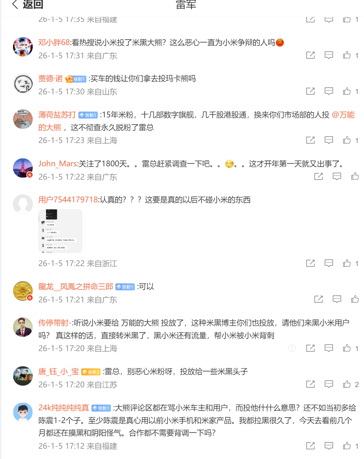 还有网友称,大熊评论区都在骂小米车主和用户,而投他什什么意思?还不如当初多给陈震1-2个子。至少陈震是真心用以前小米手机和米家产品。我都拉黑很久了,今天去看前几个月都还在摸黑和阴阳怪气。合作都不需要背调一下吗?