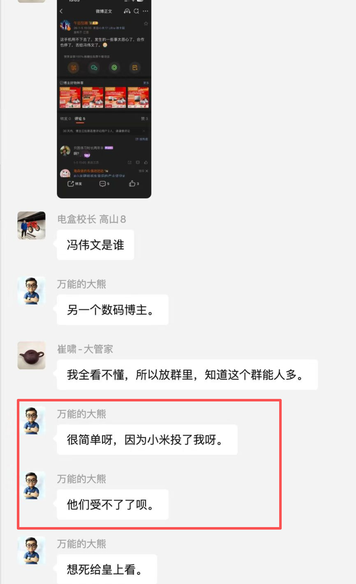 值得一提的是万能的大熊还在微信中谈到此事,他表示很简单呀,因为小米投了我呀,他们受不了呗。