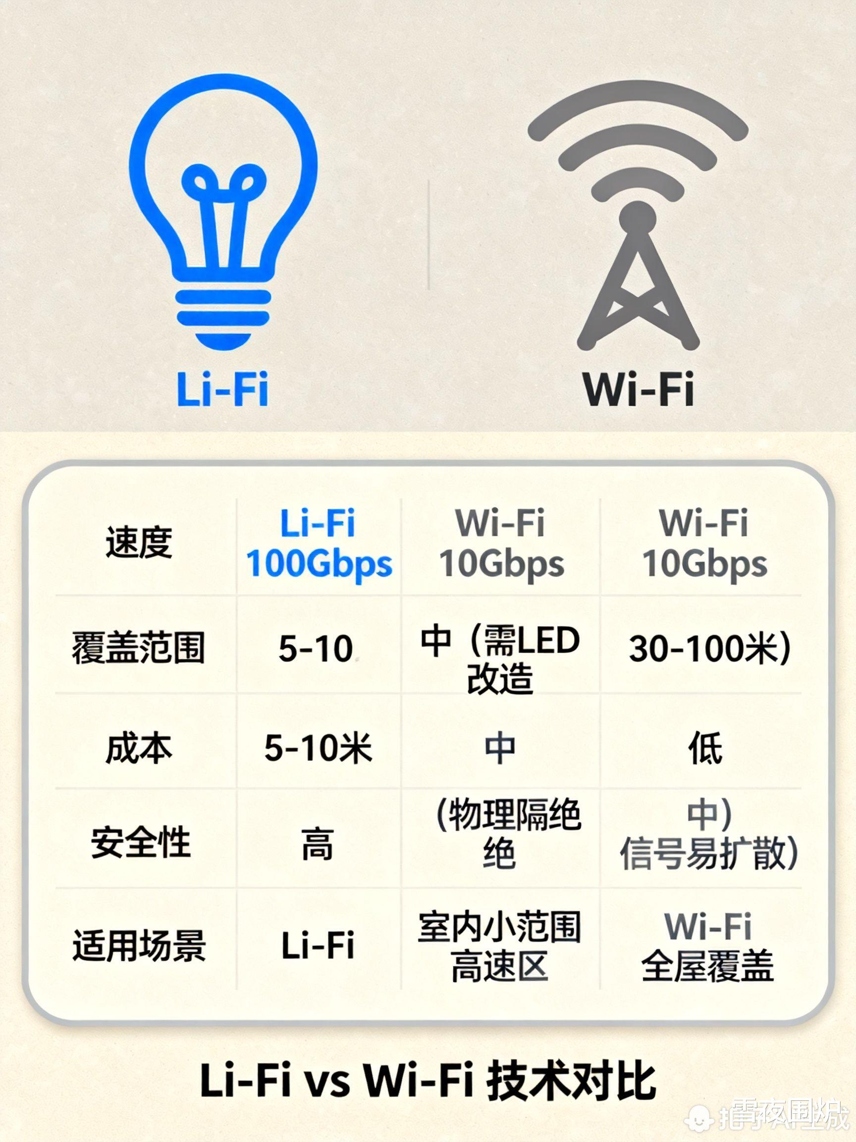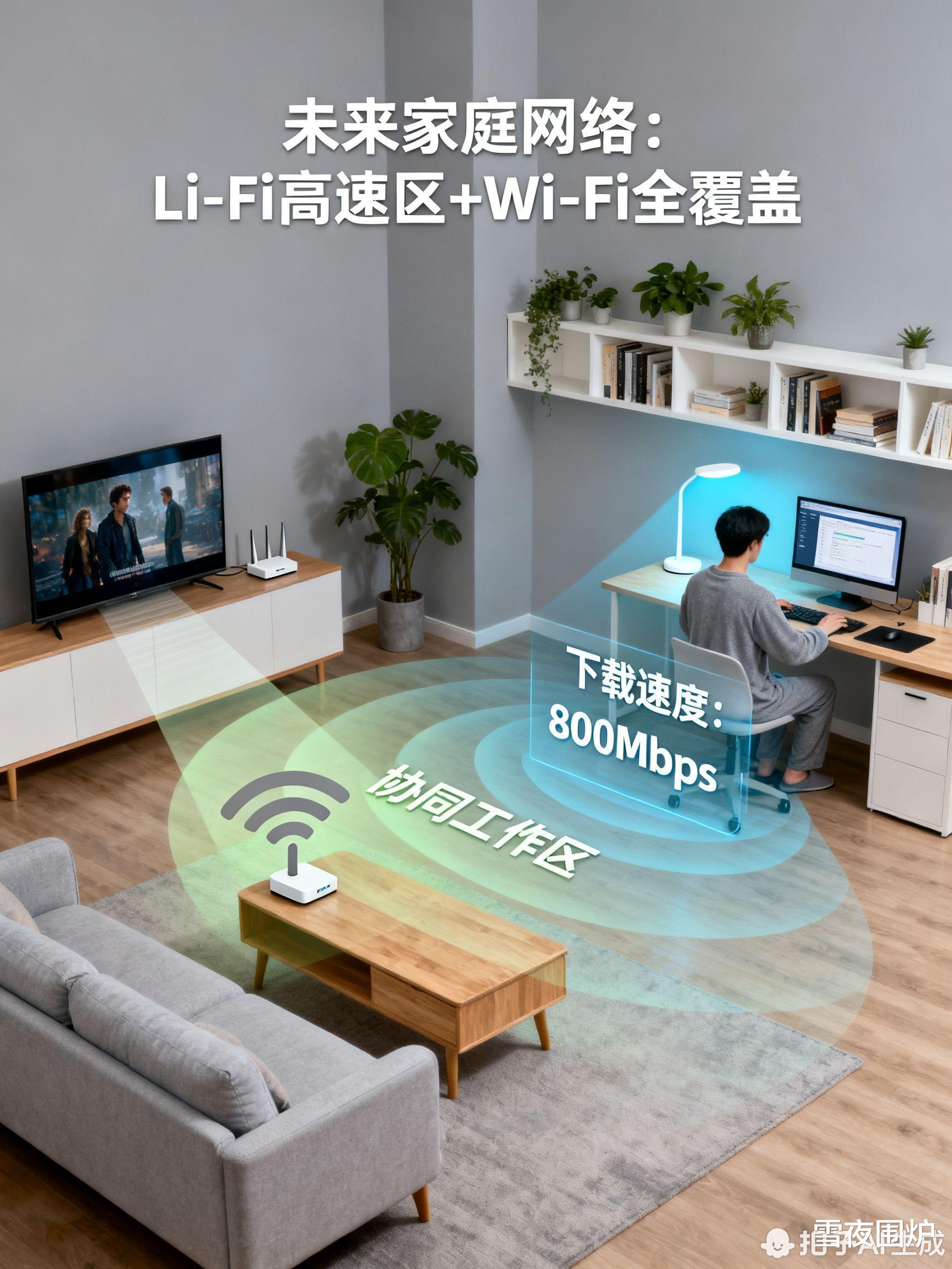 💡 核心观点:Li-Fi不是Wi-Fi的“杀手”,而是“最佳拍档”Li-Fi的超高速、高安全性,让它在特定场景不可替代——未来手术室、核电站、飞机舱将是它的主场。但受限于“依赖光源”“设备成本高”等问题,5年内难以走进普通家庭。更可能的图景是:Wi-Fi负责全屋覆盖,Li-Fi在书房、客厅等需要高速下载的区域“打辅助”,二者形成“光+无线电波”的混合网络。正如德国物理学家Haas所言:“Li-Fi的使命不是取代Wi-Fi,而是让无线网络‘多一种选择’。”