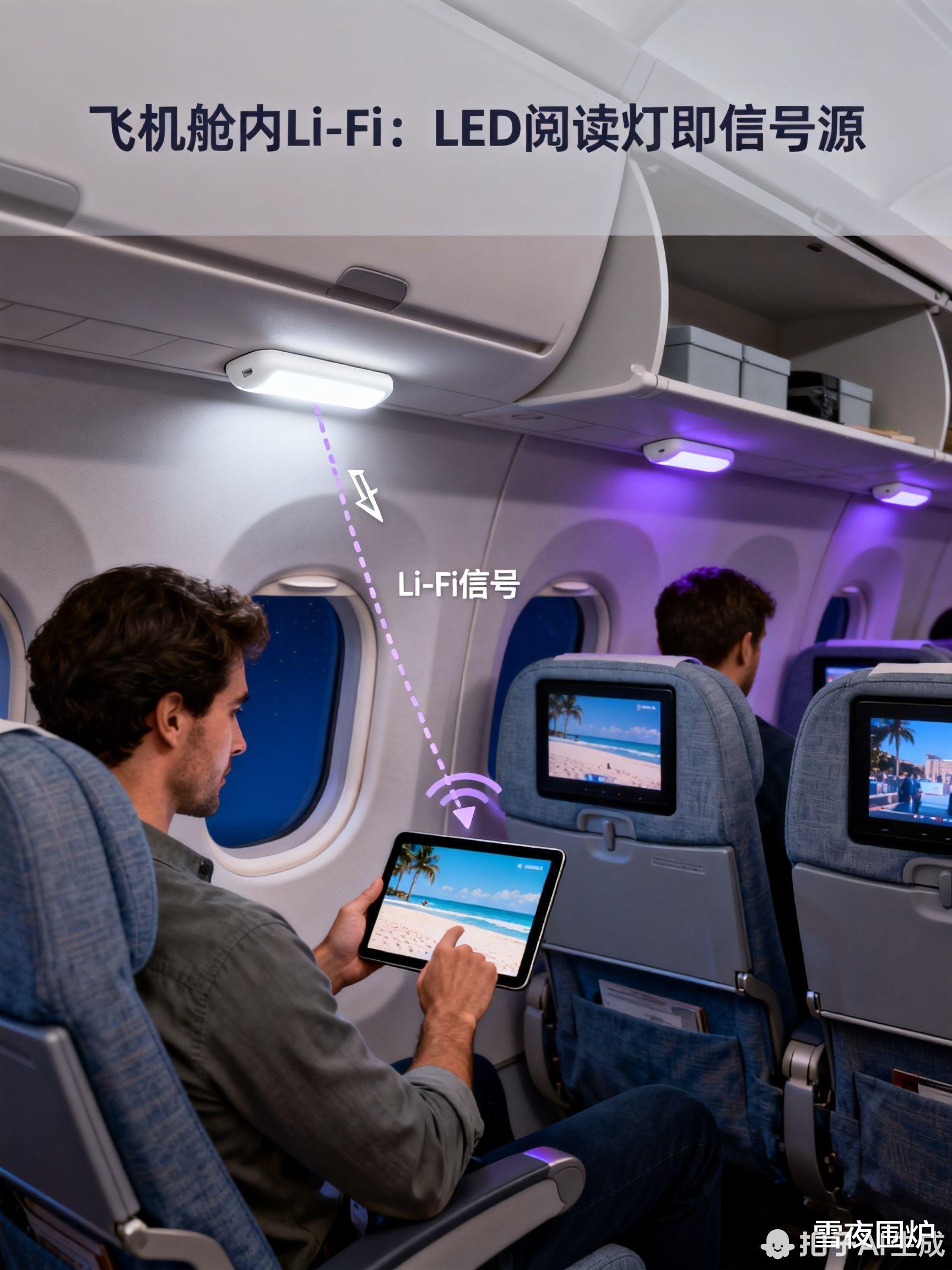 “家里没网?开个灯试试!”——2024年美国华盛顿州一家航空公司的飞机上,乘客首次体验到用LED阅读灯刷视频的“黑科技”。这种被称为Li-Fi的技术,靠灯光传输数据,理论速度达224Gbps,是当前Wi-Fi的100倍。但13年过去,为何我们的手机还在用无线电波上网?