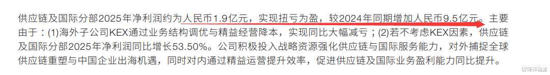 2021年,顺丰设立“供应链及国际业务”板块,其在2022年为公司贡献了34%的收入、28%的净利润。但过去两年,受国际物流环境持续变化的影响,这块业务也一直处于亏损状态, 2025年才扭亏为盈,实现营业收入729.4亿元,同比增长3.5%。