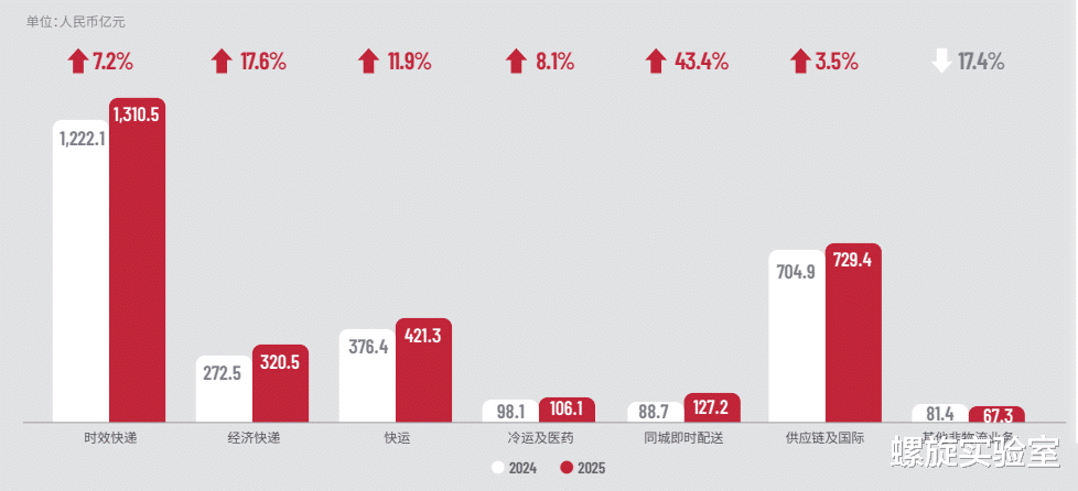 2025年,顺丰时效快递作为基本盘,收入和增长保持稳定,占总营收比重超42%。但各业务中增速最快的,却是同城即时配送业务,实现营收127.2亿元,同比增长43.4%。